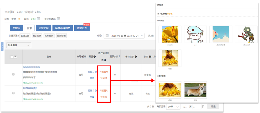 图片裁剪完毕,点击“应用图片”,确认创意后,点击“保存”,返回创意列表页,显示该组所有创意。点击图片审核状态,可以看到该组所有配图及对应审核状态。