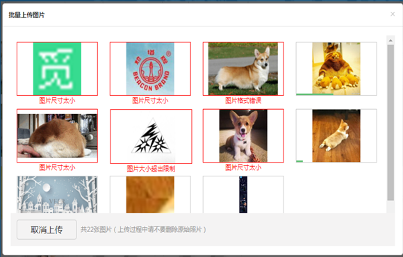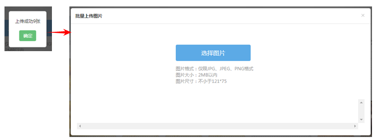 注:若批量上传的图片中有不符合要求的图片,图片下方会显示错误信息,格式正确的图片默认上传成功,删除格式错误的图片即可;若批量上传的图片全部符合格式要求,上传完毕后提示上传成功数量。