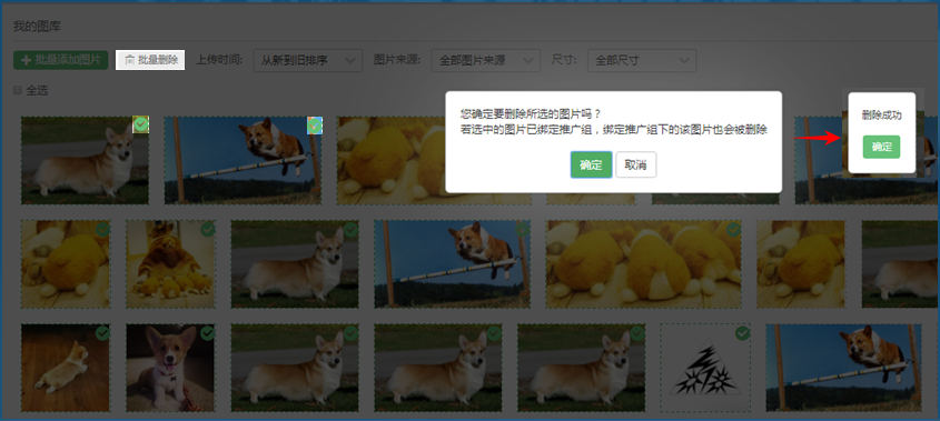 图片删除:支持单张和批量删除(全选表示选择当前页所有图片);点击删除后,会有“删除成功”弹窗提示。