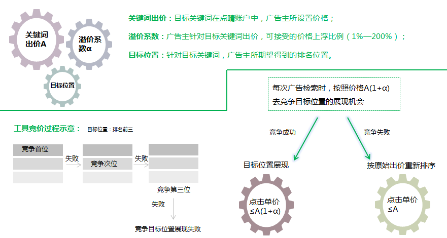 相比第三方工具为尝试性出价,官方竞价工具在每次检索时均发生,考虑真实竞价环境,响应速度快A(1+α)为高扣费,按照心理接受价格上限去设置溢价系数α,扣费在广告主可接受范围对开通凤舞高级样式的客户,排名首位可以展现更强的360广告凤舞样式,通过竞价工具可以锁定广告样式竞价失败时按照原始价格参与排序并扣费,节省了成本,保证了广告主无不必要的支出。