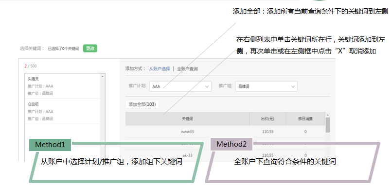 添加全部:添加所有当前查询条件下的关键词到左侧