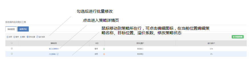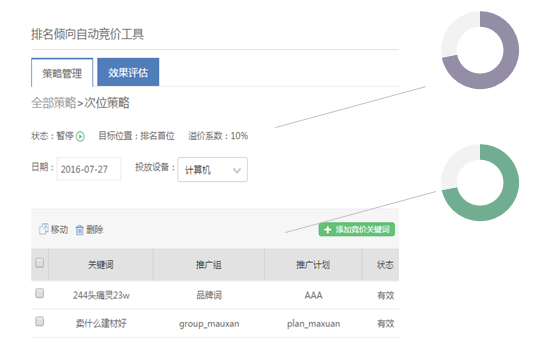 1)启用/暂停/删除:控制策略下关键词是否参与竞价策略,不会影响关键词本身的状态
