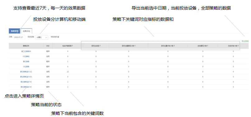 策略下当前包含的关键词,它所在的推广计划/推广组,关键词的状态。