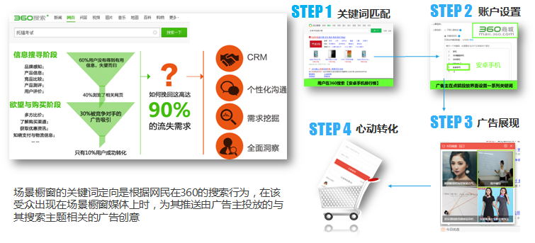 360搜索推广场景橱窗的关键词定向是根据网民在360的搜索行为,在该受众出现在场景橱窗媒体上时,为其推送由广告主投放的与其搜索主题相关的360广告创意
