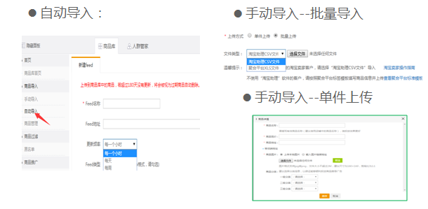 •点睛展示平台——场景橱窗广告——实用工具——商品库——自动导入—— feed方式——feed模版上传商品后——在系统添加feed名称和地址