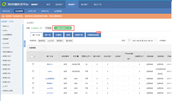 在360搜索推广产品线下的投放管理界面,当页面上方显示全部推广时,新增“一键投放展示广告”按钮如图。