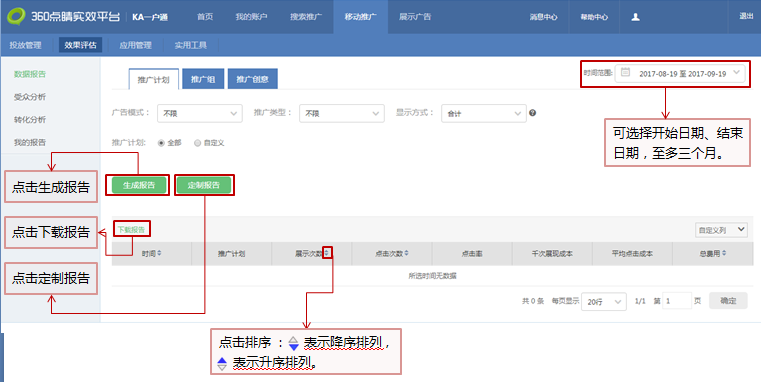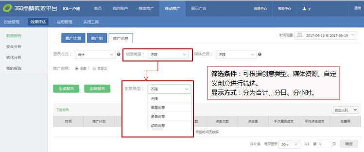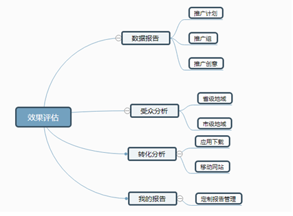 效果评估报告主要分为四个模块:数据报告、受众分析、转化分析、我的报告。