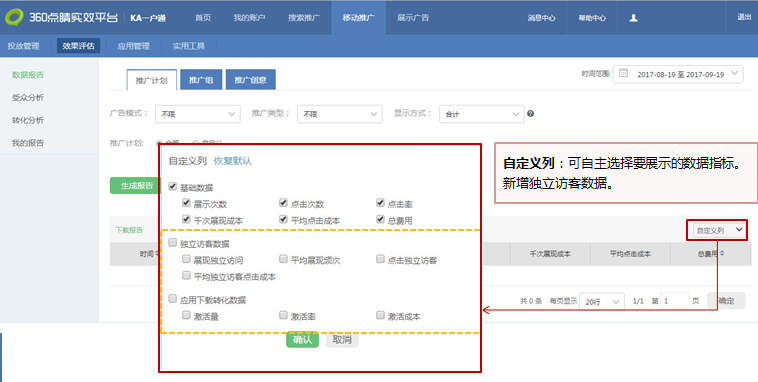 数据报告:可查看分计划/组/创意维度的详细数据;支持分小时查看,新增独立访客数据。