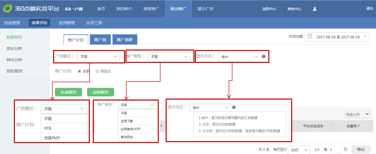筛选条件:可根据广告模式、推广类型、自定义计划进行筛选。