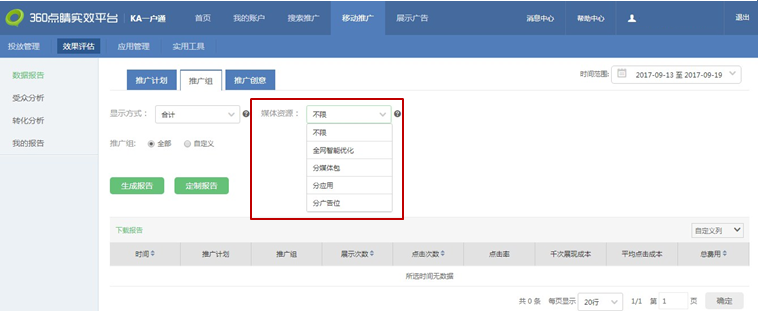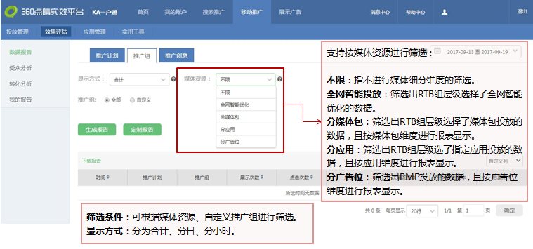 筛选条件:可根据媒体资源、自定义推广组进行筛选。