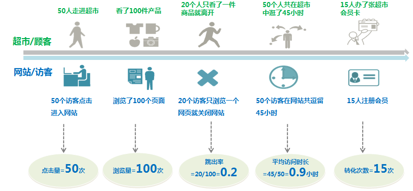 举个例子来说明,如果把一个网站比作一家超市,运营网站就像打理超市的生意,那么目标就是让访客多停留、多购买、多办几张会员卡。为了达成这个目标,我们先要了解当前的情况,比如有多少人走进了超市、看了多少件产品、多少人办理了会员卡;类似地,在网站分析中我们也要了解这些数据,并作为后续业务调整的依据:比如,多少人进入了网站、浏览了多少页面、多少人办理会员等,网站分析指标是数据化地呈现网站运营的状。