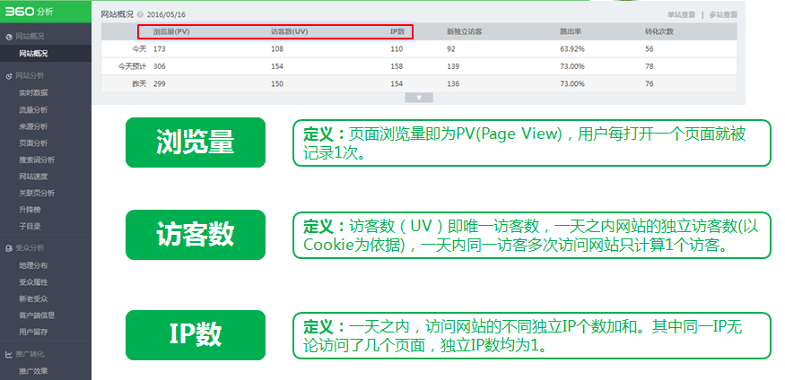 常见指标为:浏览量(PV)、访问次数、访客数(UV)、新访客数、新访客比率、IP、跳出率、平均访问时长、平均访问页数、转化次数、转化率。可以概况为3类,流量数量指标,流量质量指标,流量转化指标。