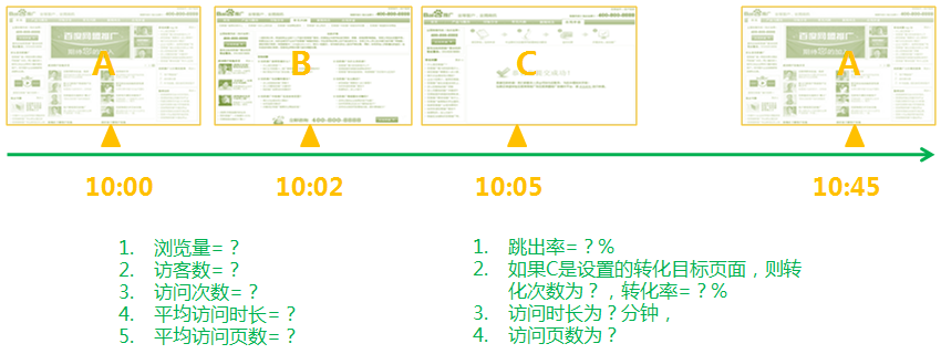 如下图是一个访客进入网站的访问行为记录,可以统计到如下指标数据: