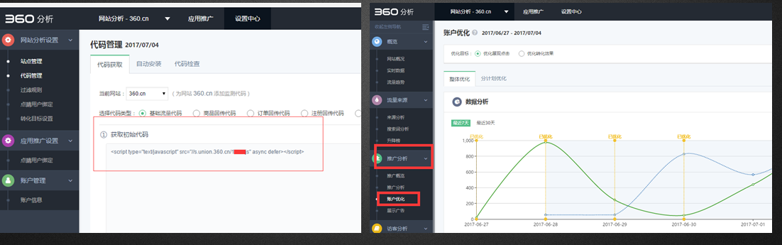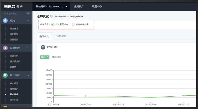 4、确认代码部署完成后点击“推广分析-账户优化”查看相关诊断建议
