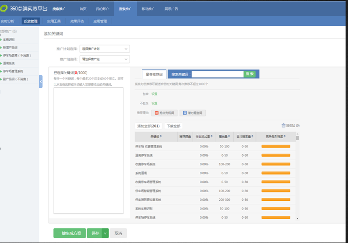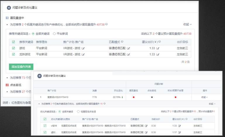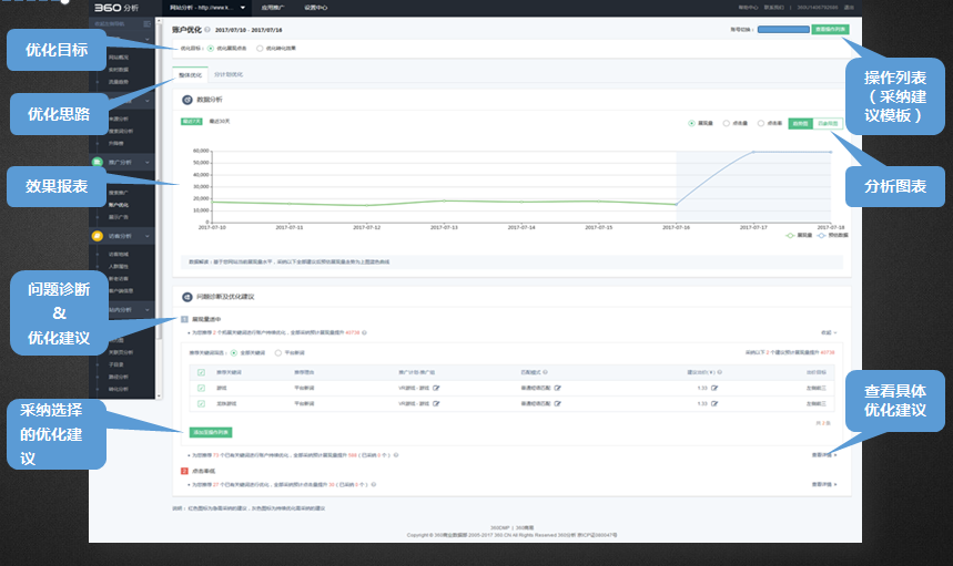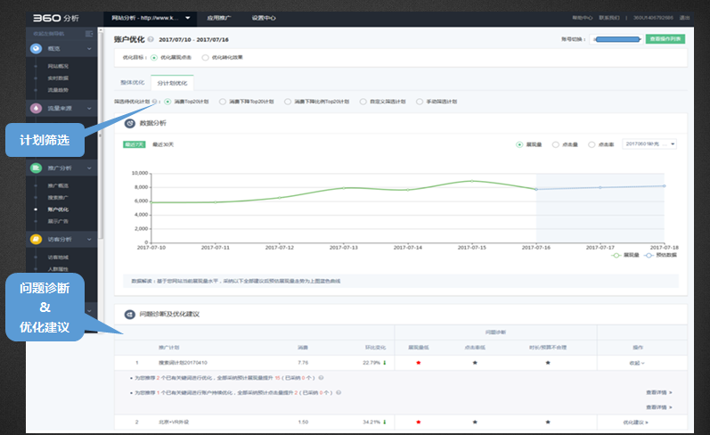 账户诊断:结合账户历史投放数据及网站流量数据,从展现量、点击率、转化率等多方面进行问题诊断360推广关键词推荐:根据客户投放数据、全网搜索数据、网站布码访问数据多方数据量身推荐相关关键词