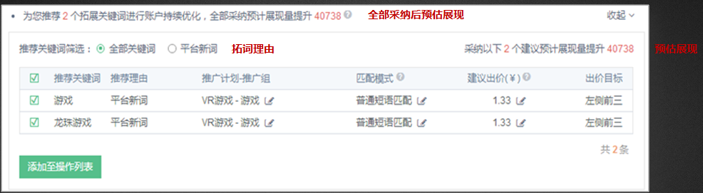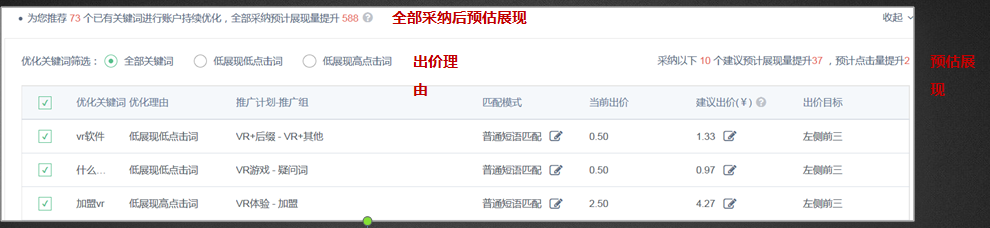 出价建议:根据关键词投放数据表现,结合同行业客户投放数据、转化数据给出关键词出价建