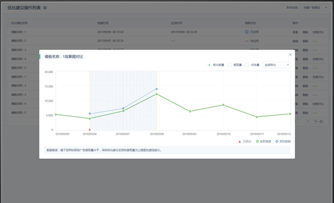 优化建议模板同步至360点睛并生效,1天后可进入操作列表查看优化模板优化效果