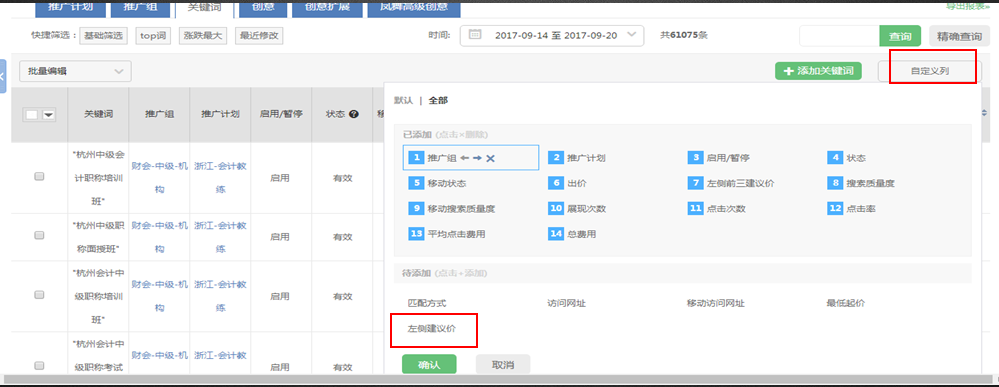 在自定义列中找到“左侧”或“左侧前三”建议价,添加至列表内。