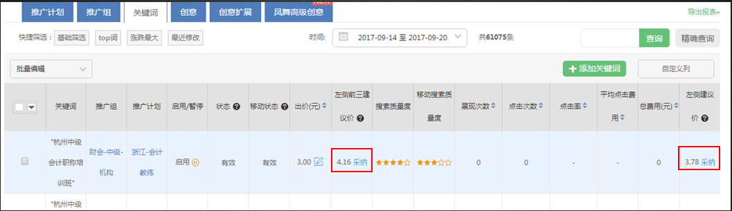 点击采内可直接对现有360搜索关键词的“左侧”和“左侧前三”出价进行调整(及时生效)