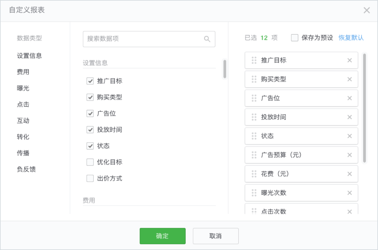 你可根据使用场景,选择查看费用类、曝光类、点击类、互动类、转化类、传播类、负反馈等各项数据指标(参见下图)。