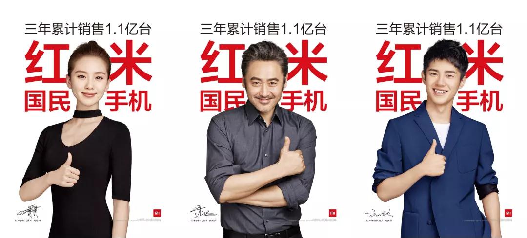 早在小米Note 2时代,小米曾邀请过梁朝伟作为其代言人,后来陆续加入了吴秀波、刘诗诗、刘昊然等明星作为其红米的代言人。目前,当红明星吴亦凡为MIX 2、小米6X以及小米Note 3的代言人。