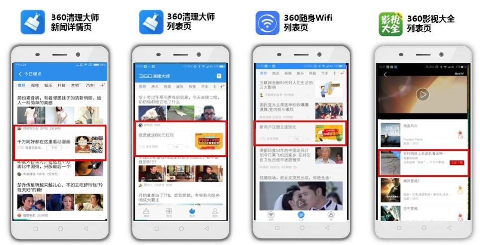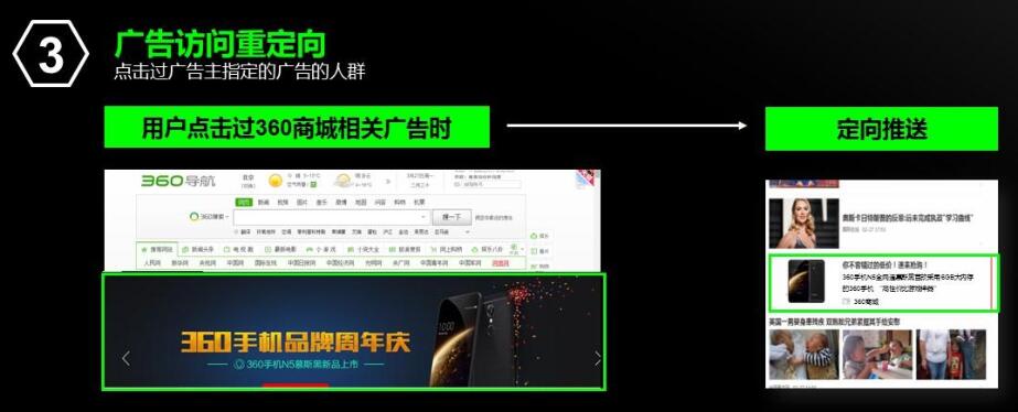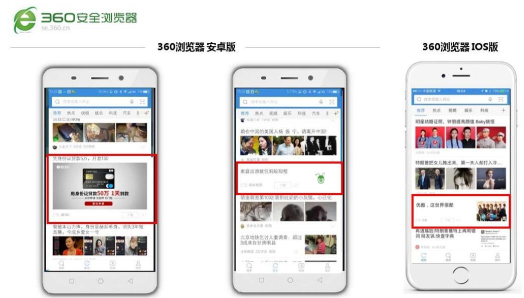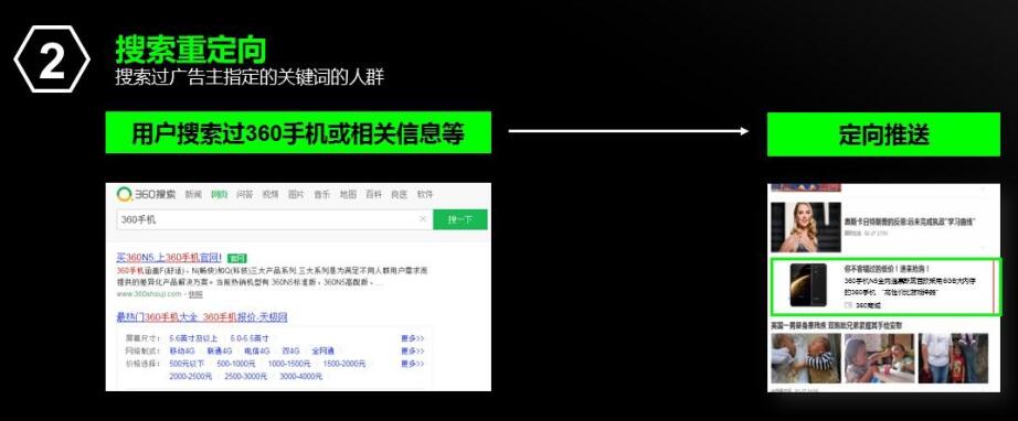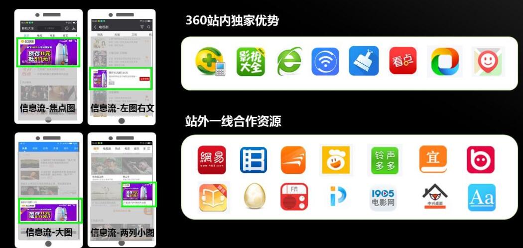 360信息流广告,打通360全线优质产品矩阵,通过360行为链大数据精准定向和重定向,在内容信息流中传插展现的原声广告。