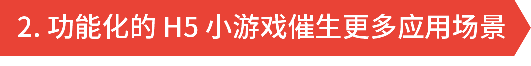 和 18 年 H5 小游戏抢开屏抢入口的高调不同,如今一些 H5 小游戏被流量平台做成了产品辅助功能。这既不会喧宾夺主,也给用户更好的应用场景。例如快手广告小游戏和短视频分享的打通;电商类网站利用 H5 游戏派发优惠券,或通过独家的小游戏和社交分享功能拉新;打车软件里玩游戏度过车上时间,社交软件里玩游戏进行社交破冰;直播博主和观众玩游戏互动等等。