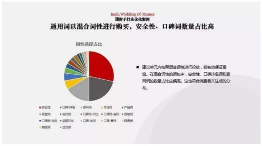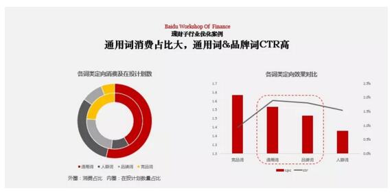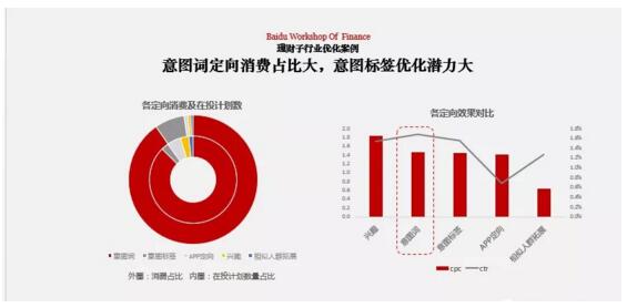 从定向的消费占比看,目前百度理财账户,大部分使用意图词进行定向。意图标签是目前消费潜力较大的新定向方式。从效果上看,意图词和意图标签定向,同样是百度广告投放中表现较好的定向方式。