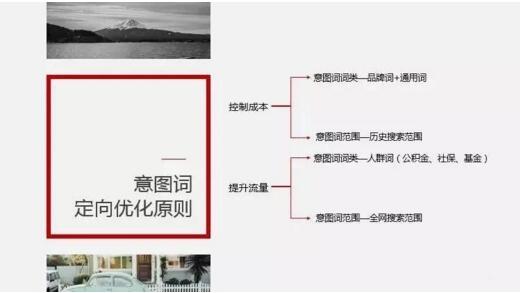 总结意图词定向优化原则,在控制成本阶段,词类选择上可以优先选择品牌词和通用词进行投放,意图词范围选择历史搜索;在提升流量阶段,可以选择公积金、社保、基金类人群词拓量,意图词范围选择全网行为。