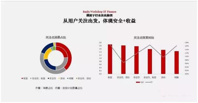 从创意素材内容看,与消费者关注点相符,收益类及安全性创意消费量级较大。从效果上看,安全+收益及明星类的文案较能吸引点击。