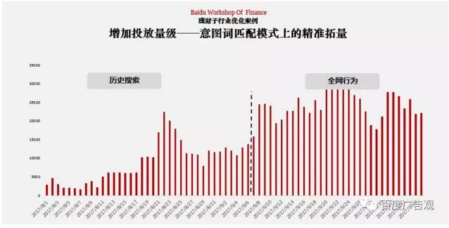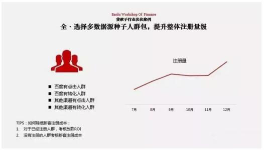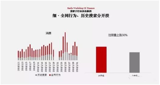 在拓量阶段,相同的定向在全网行为和历史搜索进行分别投放百度广告,同时进行差异出价,注册量上涨30%,拓量能力效果显著。