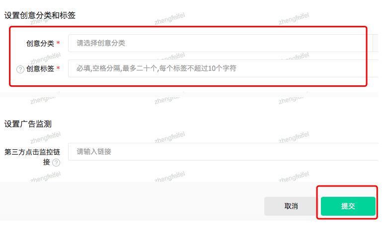 8、添加创意分类,创意标签,点击提交即可进入审核,审核通过后会开始投放