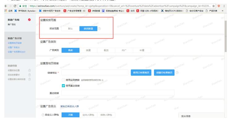 3、选择投放类型(目前资讯联盟-直投支持应用下载,落地页,商品推广)