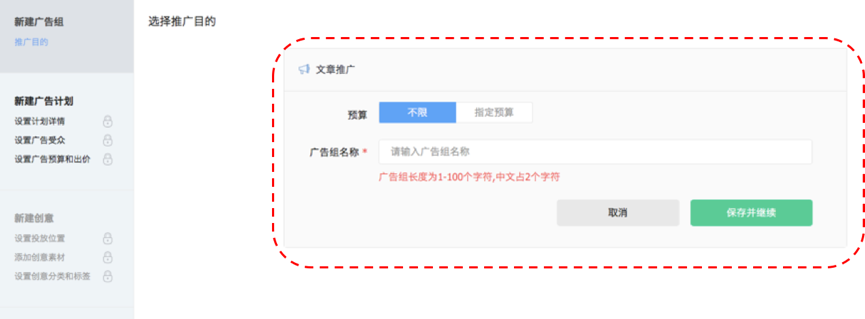 2、推广目的选择“文章推广”,设置预算,填写广告组名称并保存。