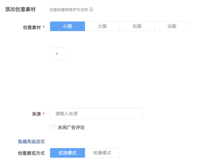 创意展现方式:系统默认优选模式,广告投放前期建议选择轮播模式,中后期可根据广告的展示量和点击量选择优质广告改为优选模式。