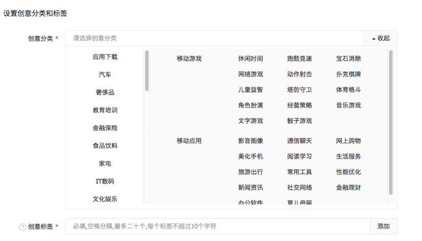 创意标签需要提供针对产品或者服务属性的若干标签,将有助于提高广告预估点击率。