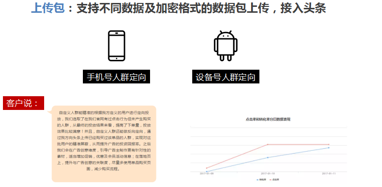 基于广告主当前的用户数据、快手广告历史点击用户数据或者其他第三方数据,通过上传IMEI/IDFA的方式锁定这部分人群,进行老用户二次营销,提高转化率,特别适合金融、游戏等领域。