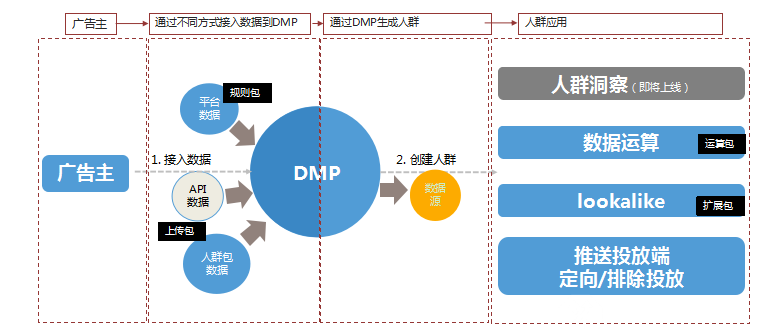 通过DMP创建的人群包,可以推送到投放平台中进行人群定向。作为特殊的定向条件,参与到广告计划投放过程中的受众筛选的步骤中。