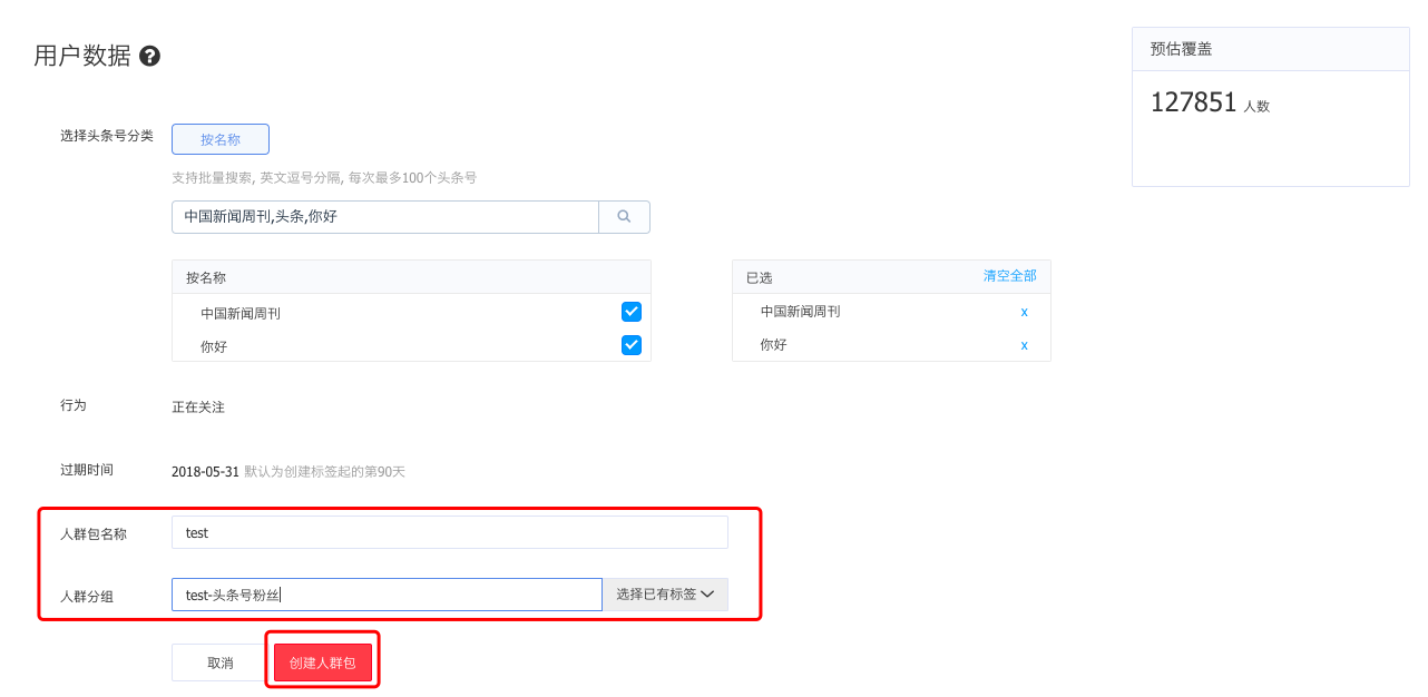 第二步.填写人群包名称,填写新人群分组/选择已有分组,点击创建人群,生成头条号粉丝人群包
