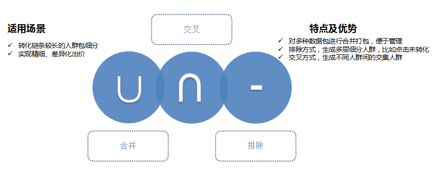 通过运算包功能的合并、交叉、排除等操作,您可以创建多种人群细分。例如,通过采用排除操作,从点击人群中排除已下载人群,可生成点击未下载人群,进行追投操作。