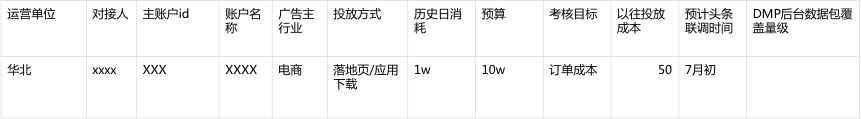 1.销售对接需求,发送邮件至zhangxiyue@bytedance.com,zhengfeifei@bytedance.com, 抄送dmpadyy@bytedance.com,内容包括:考核目标、预算、技术排期