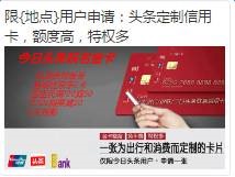 例如下面的创意:同样是对头条用户推荐信用卡定制,当用户在浏览广告时,突然看到自己所在城市名,显然会更能吸引注意,这个创意也因为加入“地点”这样一个会根据自己实际所在城市动态变换的词包,与用户产生了更强的关联。而且“仅限地点”这样的词语,更能体现出用户的限定专属感。