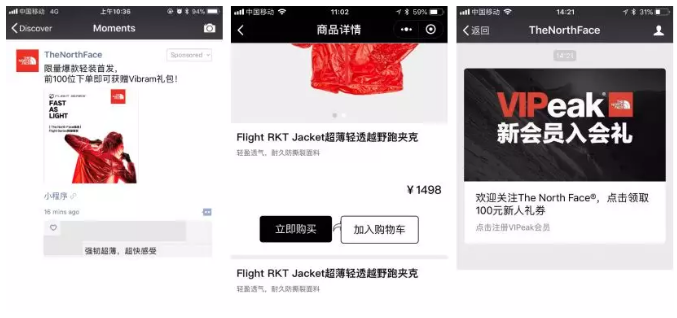 如今,很多品牌已经关注到了电商平台的这些问题,也开始尝试一些新蓝海。The North Face,日前在微信公众号上,上线了一个“尖货平台”,试水差异化社交电商,并取得了前文所述的成绩。