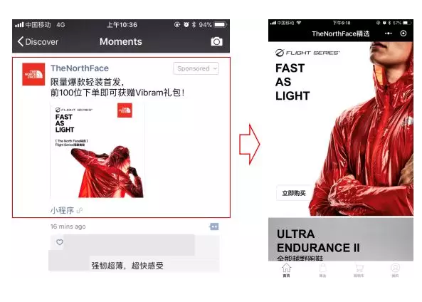 全球顶级户外服饰品牌The North Face,前不久在微信小程序广告【TheNorthFace精选】上售卖的一款限量Flight Series超薄轻透越野跑夹克,创造了1小时120件的成绩。同款在其他电商平台累计的数字仅为日均10件。7天下来的总和数据,微信小程序上的销量更是其他电商平台总和的20倍之多。