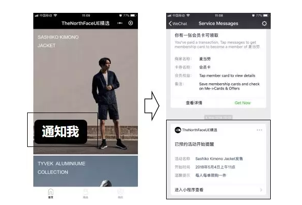 在无上新无广告引流的情况下,日常流量都能维持在200-300人。在这里,品牌的理念、科技、价值观不断地输送给生态里的忠粉。忠粉“毕业”后,顺理成章的成为品牌的义务讲师,继续影响身边的好友们,让小生态如细胞分裂般快速扩张生长。在前不久的【TheNorthFaceUE精选】小程序限量款秒杀抢货活动中,公众号通过小程序提前预约通知,售前1小时模版消息召回,在无广告投放的情况下,同样全部售罄。