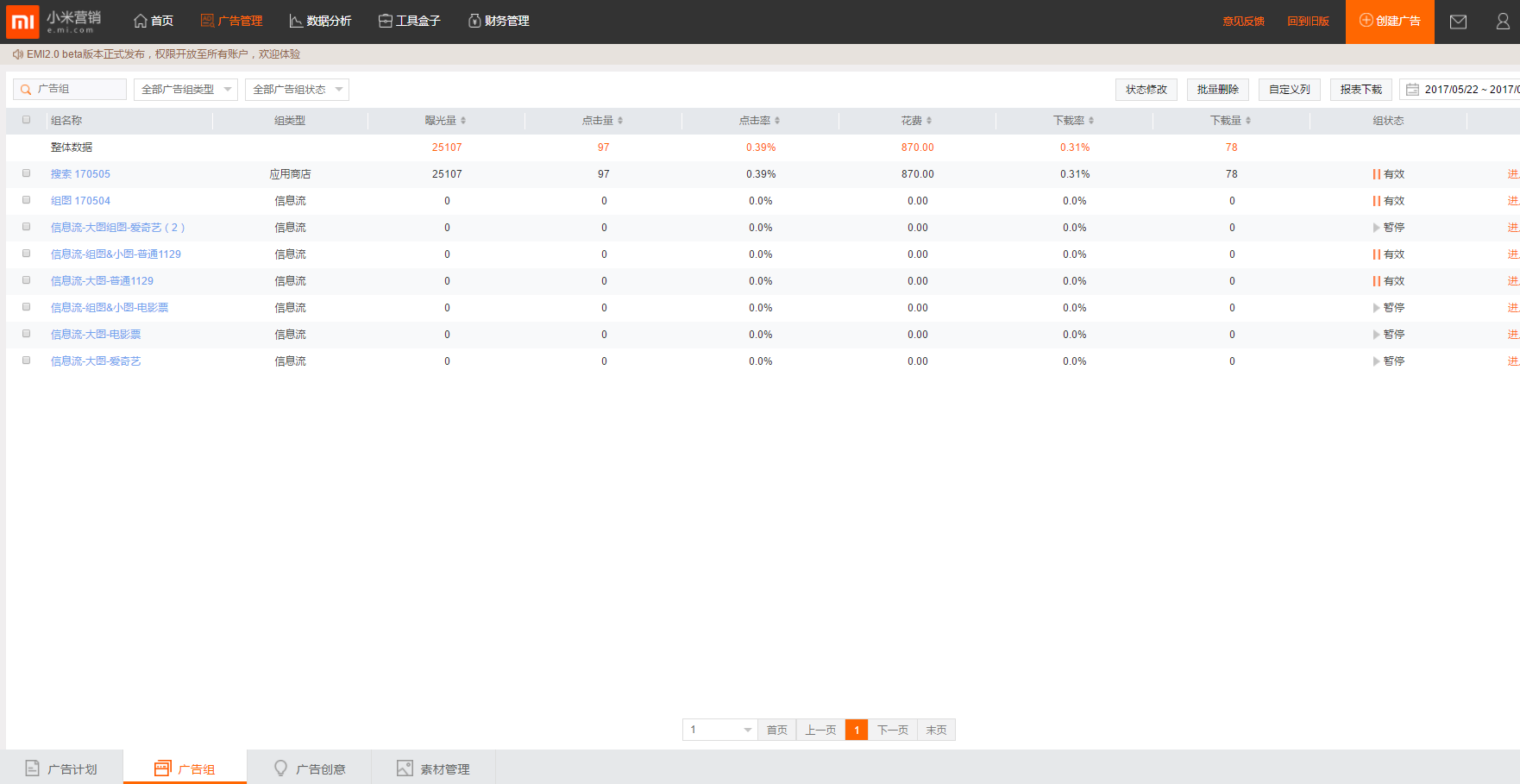 小米广告管理页——为广告计划/组/创意/素材及各层级编辑/新建入口页面,并具备一定数据报表功能。(详见《广告创建和管理》)