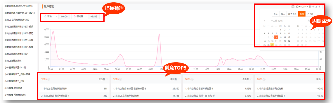 账户总览:登录账户默认展示账户总体数据,账户总体投放情况查询;