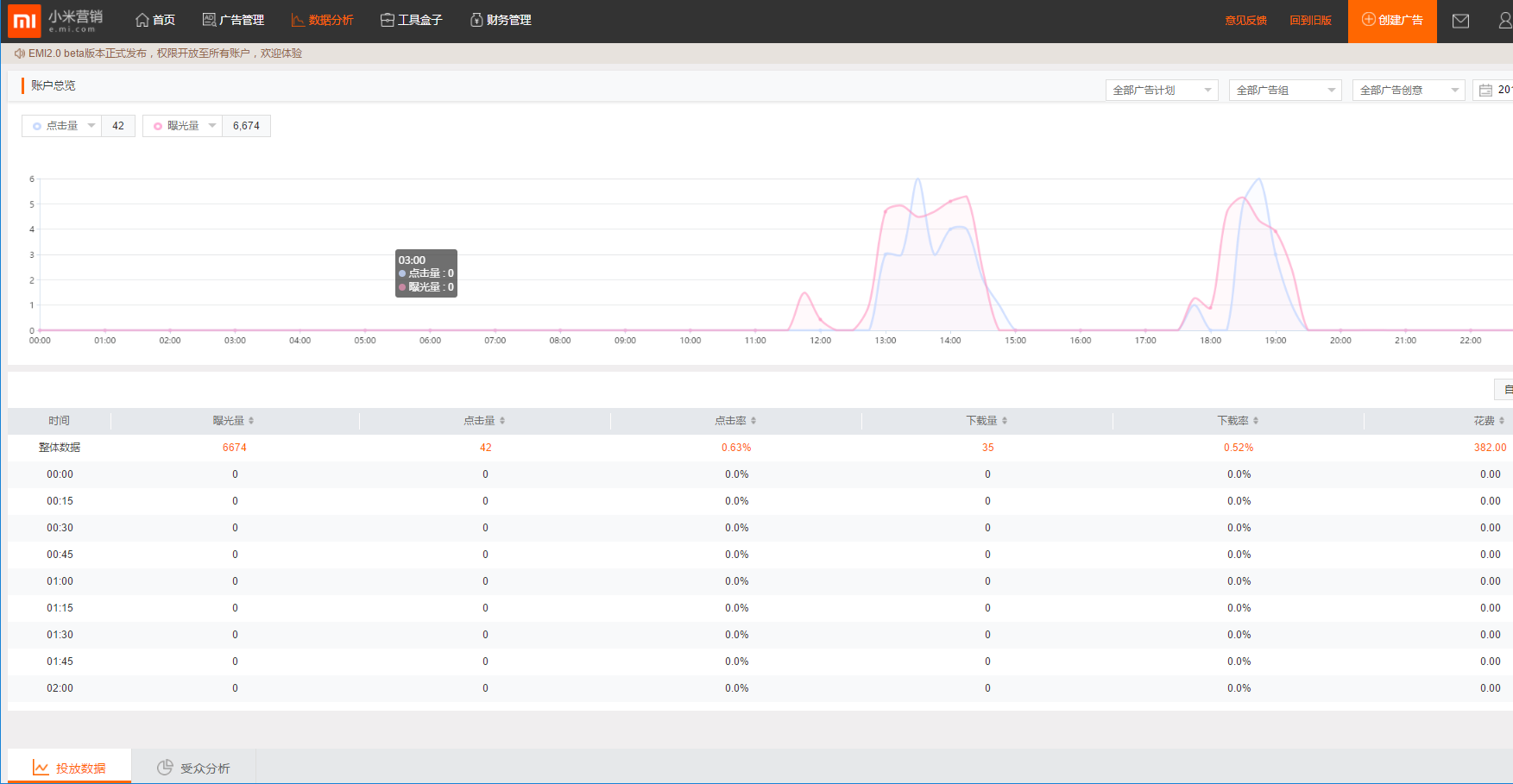 数据分析页——展示小米广告账户投放各维度投放数据及具体受众相关数据。(详见《数据查看和分析》)