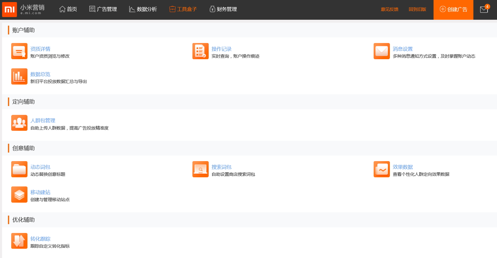 工具盒子——提供账户辅助 [资质详情、操作记录、消息设置、数据总览]、定向辅助 [人群包管理]、创意辅助 [动态词包、搜索词包、效果数据、移动建站]、优化辅助 [转化追踪] 等工具。(详见《投放辅助工具》)