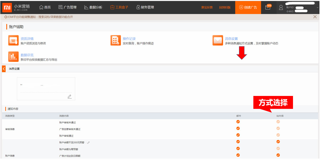 消息设置:支持多种消息通知方式设置以便随时掌握小米广告账户信息动态。